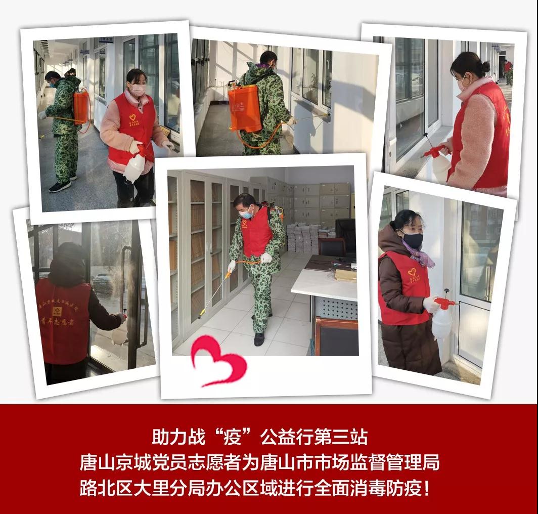 2月19日上午8点50分,唐山京城皮肤医院党支部龚兰珍书记带领党员志愿者,来到唐山市市场监督管理局路北区大里分局,为在疫情中坚持抽检服务监管,保障广大人民群众食品安全的工作人员消毒。志愿者们为他们的办公区域进行全面的喷杀消毒,从走廊、到扶手、门把手、每一间办公室……大家仔细、认真的消毒,不放过任何一个区域!看着志愿者们认真的消毒,市场监督管理局的领导连连说着感谢,“非常时期,感谢你们的支持!”