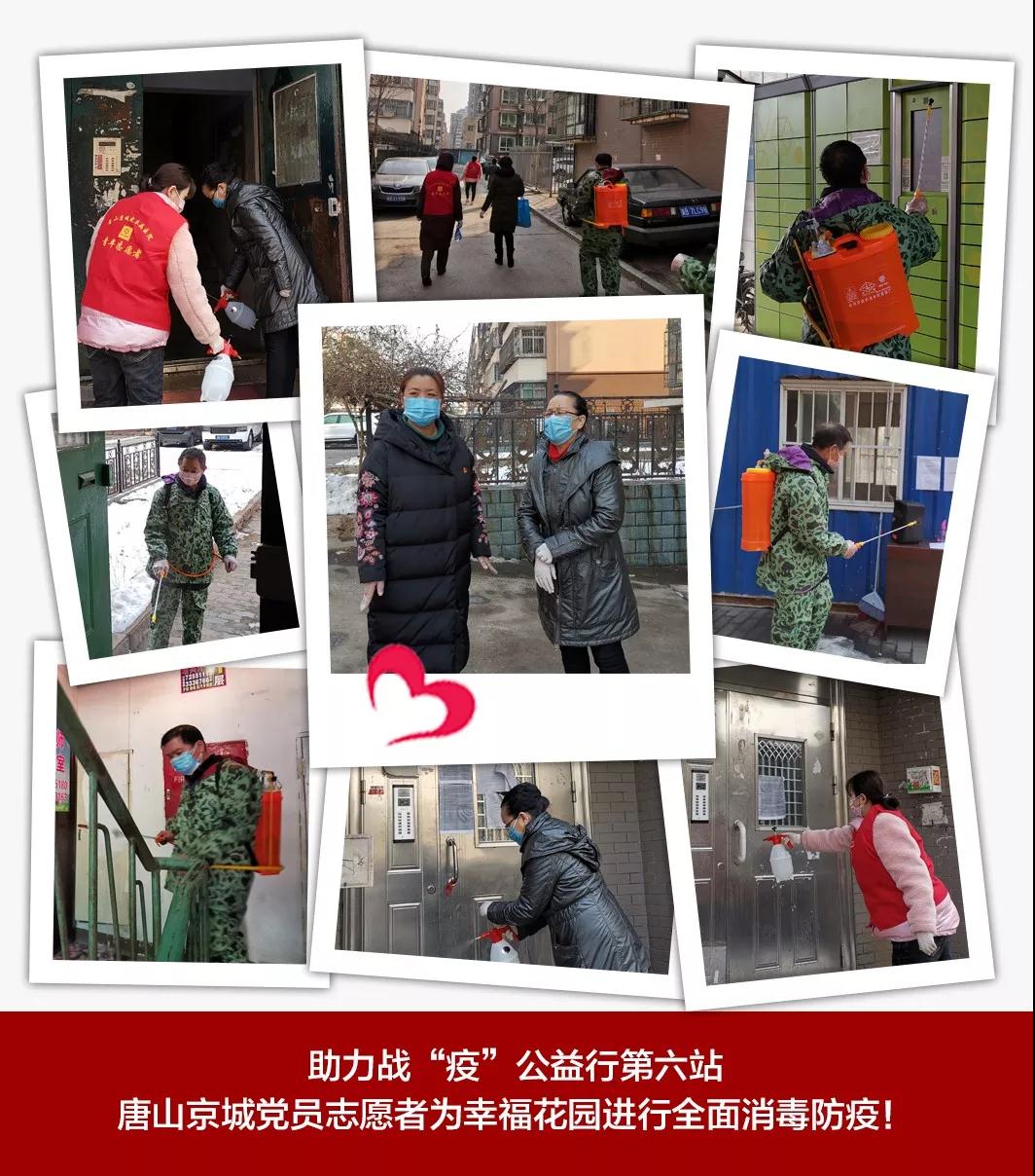 2月19日下午2点,唐山京城皮肤医院党支部龚兰珍书记带领党员志愿者,来到唐山市路北区幸福花园小区,社区郑书记一边介绍目前遇到最大的难题就是居民楼道消毒喷杀问题,一边感谢京城党支部非常时期的鼎力支持,你们真是我们社区的及时雨!志愿者们在龚书记的领导下,背着沉重的的消毒液,从一楼跑到6楼,老党员刘焕柱衣服都已湿透,志愿者陈子芳的汗水模糊了双眼,但是他们依然咬着牙,穿梭在每一个楼口、每一栋楼、检查站、快递柜……社区小杨感动的说:我代表社区谢谢你们,你们是最美的志愿者!