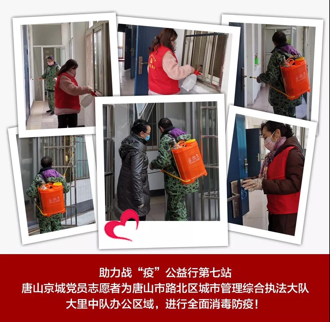 2月19日下午3点30分,唐山京城皮肤医院党支部龚兰珍书记带领党员志愿者,来到唐山市城市管理综合执法大里中队,为他们的办公室、楼道、门把手等办公及公共区域进行全面彻底的喷杀消毒,看着志愿者们一丝不苟消毒的样子,城管中队的警官们纷纷伸出大拇指点赞!