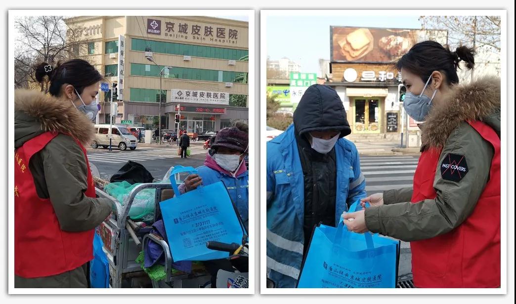 2月20日上午,唐山京城皮肤医院党员志愿者们,为医院周边坚守在路上清扫路面、铲除积雪的环卫工人,每人赠送10片一次性口罩,感谢他们为了城市的干净整洁,在疫情中依然坚守岗位,叮嘱他们做好防护措施,注意身体!