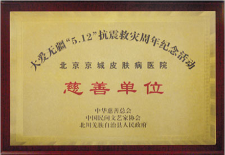 2007年7月26日 北京京城皮肤医院受邀参加主题为“大爱无疆,5.12抗震救灾周年纪念活动”以及保护羌族文化遗产成果发布会,并授予慈善单位荣誉称号。